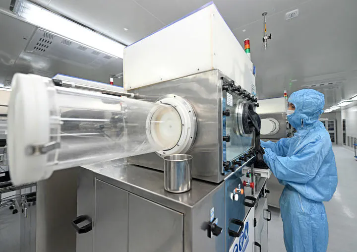 9月9日,在赛诺医疗科学技术股份有限公司天津生产基地,工作人员在净化车间喷涂室确认支架药物喷涂机的参数。新华社记者 赵子硕 摄