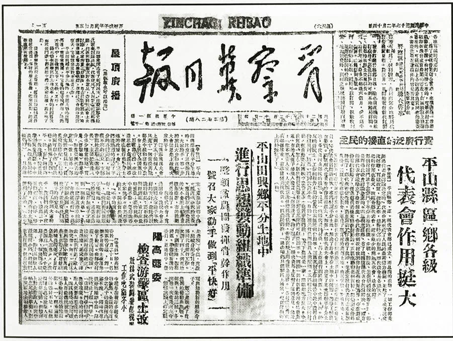 ◆1948年2月14日,《晋察冀日报》报道平山及田兴乡土地改革情况。