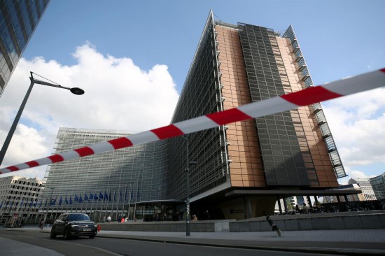 10月4日,在比利时布鲁塞尔,车辆驶过欧盟委员会大楼。新华社记者赵丁喆摄