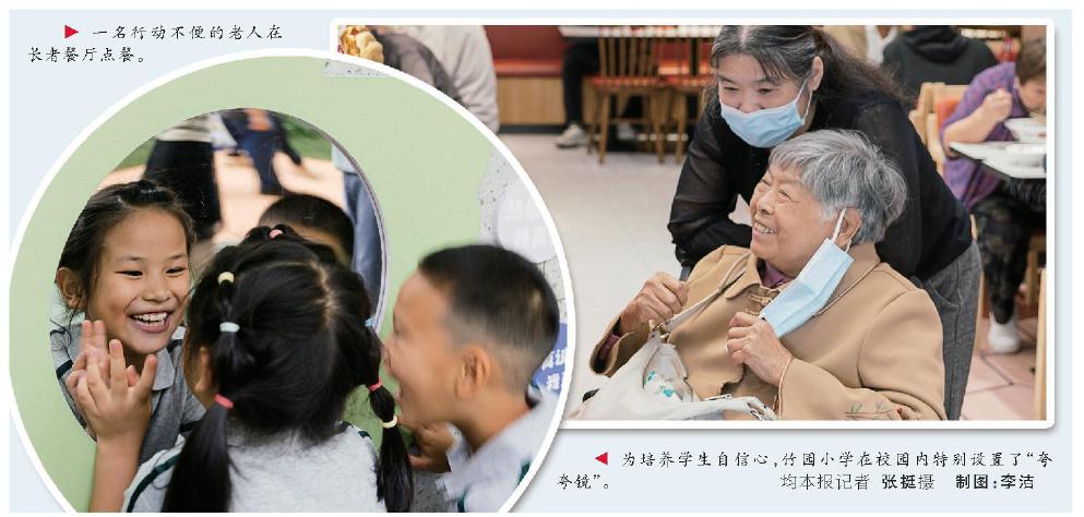 一名行动不便的老人在长者餐厅点餐。 为培养学生自信心,竹园小学在校园内特别设置了“夸夸镜”。 均本报记者 张挺摄 制图:李洁