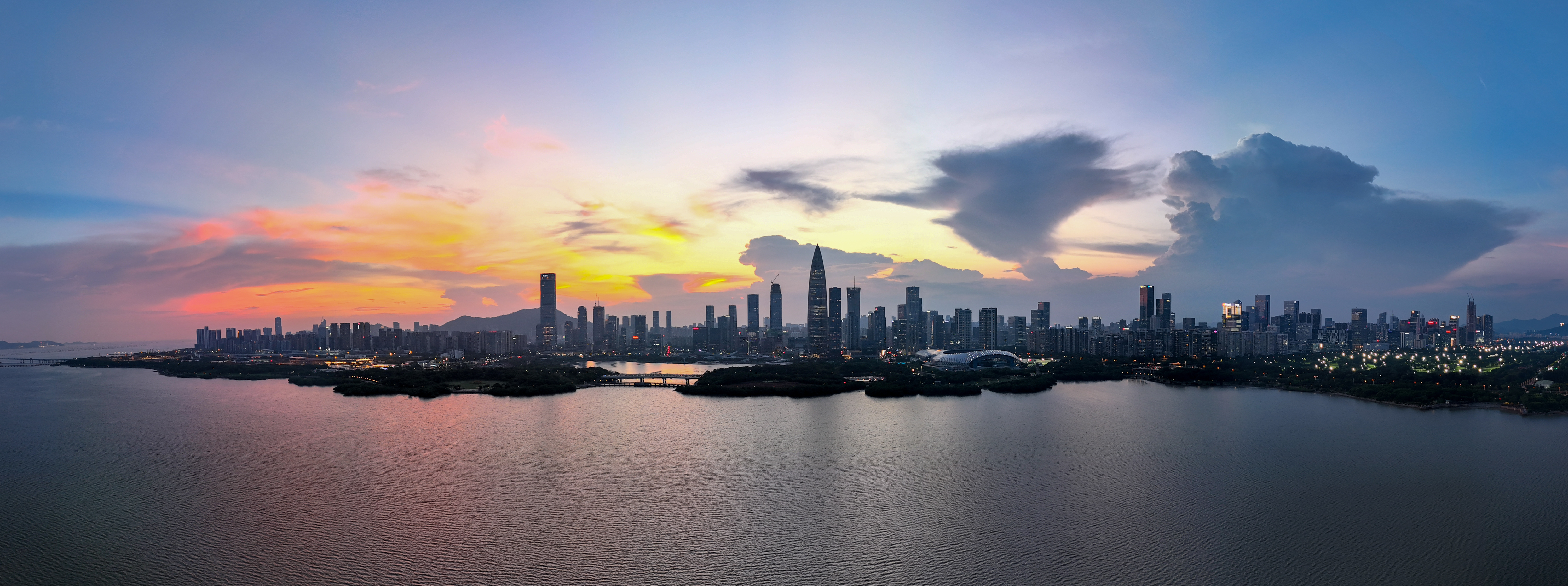 8月30日拍摄的晚霞映照下的南山区深圳湾(无人机全景照片)(新华社)