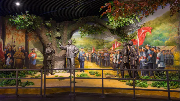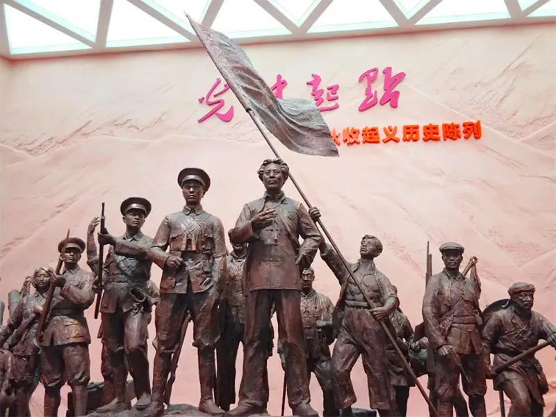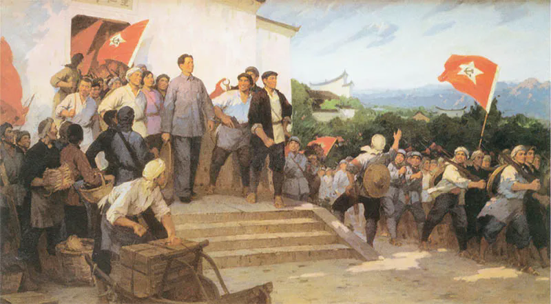 1927年9月9日,湘赣边界秋收起义爆发。起义领导人毛泽东写下的《西江月·秋收起义》:“军叫工农革命,旗号镰刀斧头。匡庐一带不停留,要向潇湘直进。地主重重压迫,农民个个同仇。秋收时节暮云愁,霹雳一声暴动。”生动地描述了起义的情景。毛泽东领导起义的武装编为工农革命军,打出了中国共产党领导武装起义的旗子,确立支部建在连上的原则,开始创建井冈山革命根据地的斗争,找到一条“农村包围城市、武装夺取政权”的正确道路。