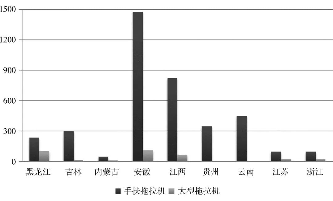 以1973年前已支援各地的拖拉机数量为例(见图1),地区分布上,主要集中于安徽、江西两省,黑龙江、吉林、贵州和云南也是重点省份,因为这几个省是上海插队知青的主要安置区。另以1975年上海援助外地物资的分配比例为例,安徽省为42.3%,江西省为31.1%,吉林省为4.2%,黑龙江省为3.4%,贵州省为1.1%,云南省为1.1%,内蒙古自治区为0.3%,江苏省为2.9%,浙江省为2.9%。