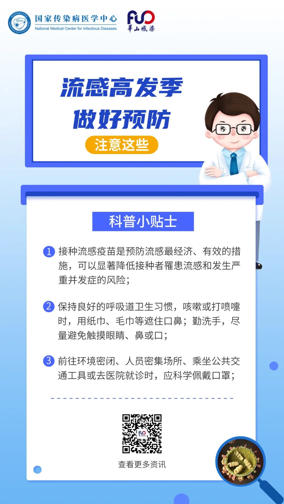 秋冬季流感高发,疫苗是你的防护盾,健康生活是你的保护伞。做好防护,和流感说再见!希望大家能够安全健康的度过这个秋冬季。