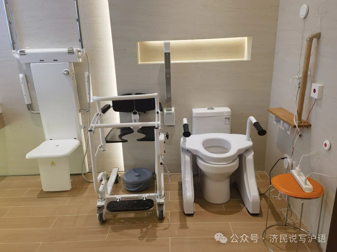 看到椅式座便器,供老人坐在上面大便。还看到放在抽水马桶上的手扶式椅子,有把手可供老人坐下、站起。墙上装有警报开关,如需要可及时报警。