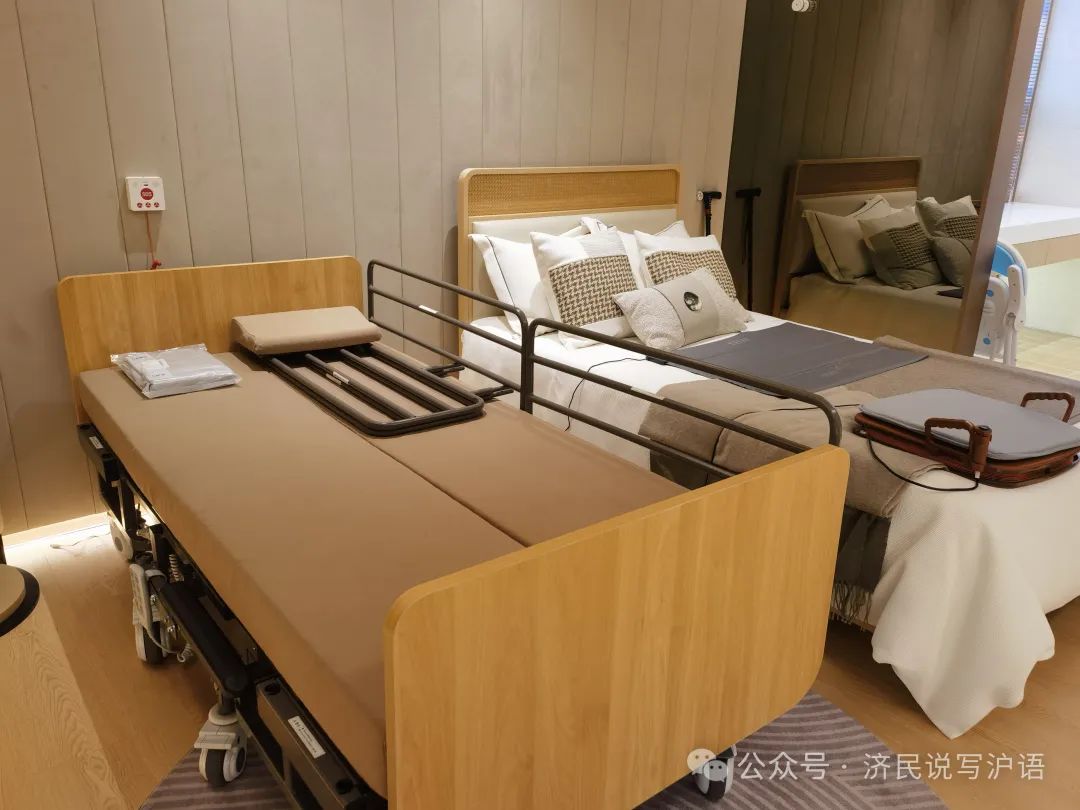 在卧室,我看到了2张床。一张是护理床,供需护理的老人用。有开关可操作以满足各种需要。
