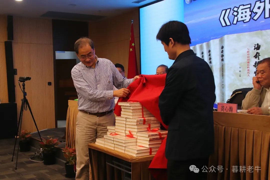 发布会开始后,研究会会长金光耀和出版方代表上海人民出版社党委副书记何文权揭开主席台前蒙着的红绸,一堆崭新的书籍出现在大家的面前,《海外扬帆》一书宣告正式面世。这一历史时刻立刻引起了无数关注的目光,闪光灯亮成一片,快门声响动一片。随后,赠书、发言,气氛热烈,将发布会推向了高潮,尤其是原中宣部副部长龚心瀚的致辞,主编方韧、研究会宣传部门负责人马琳和上海人民出版社党委副书记何文权的有关该书编辑出版的介绍,本书顾问、原社联党组书记沈国明,研究会原会长阮显忠发言,更是引起了大家的共鸣。