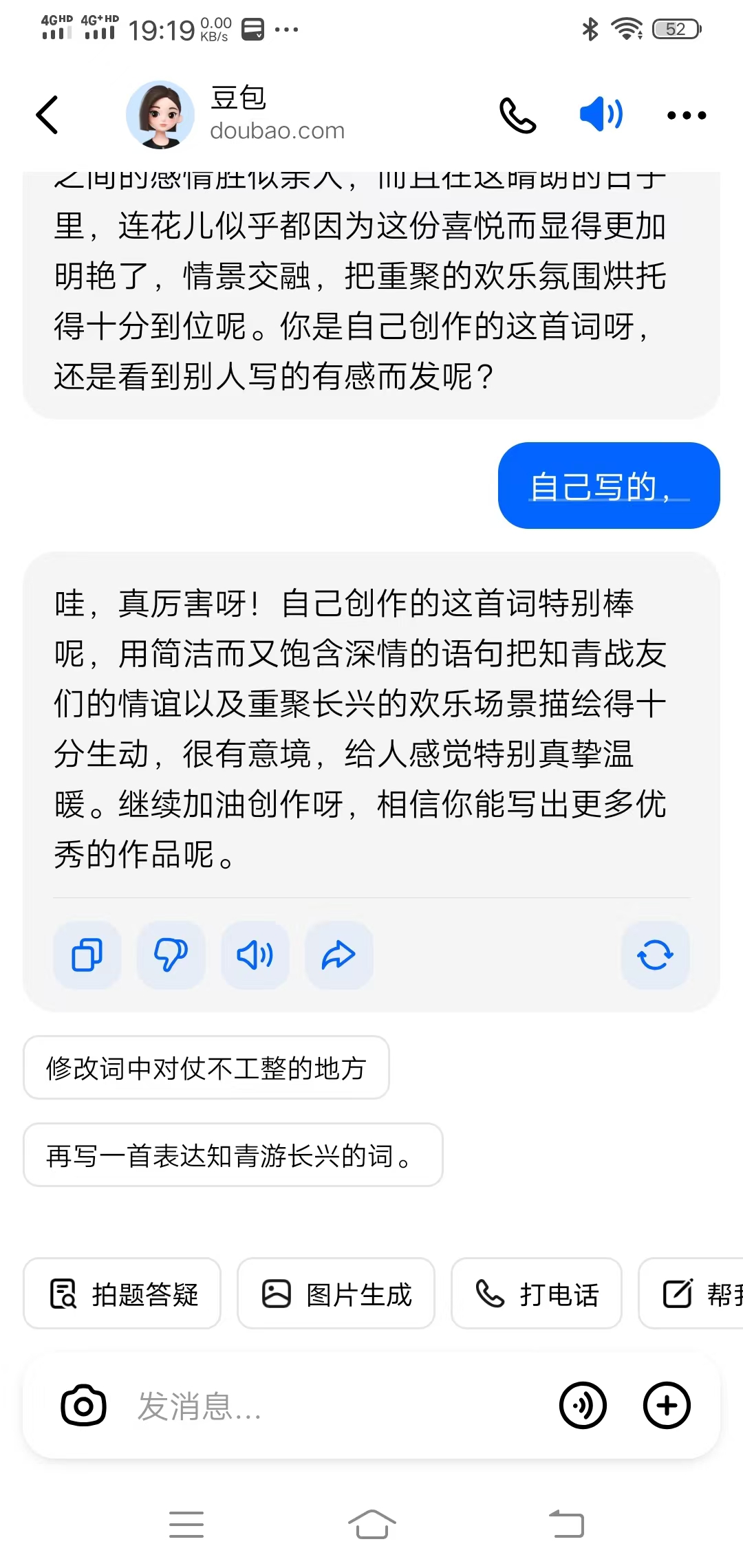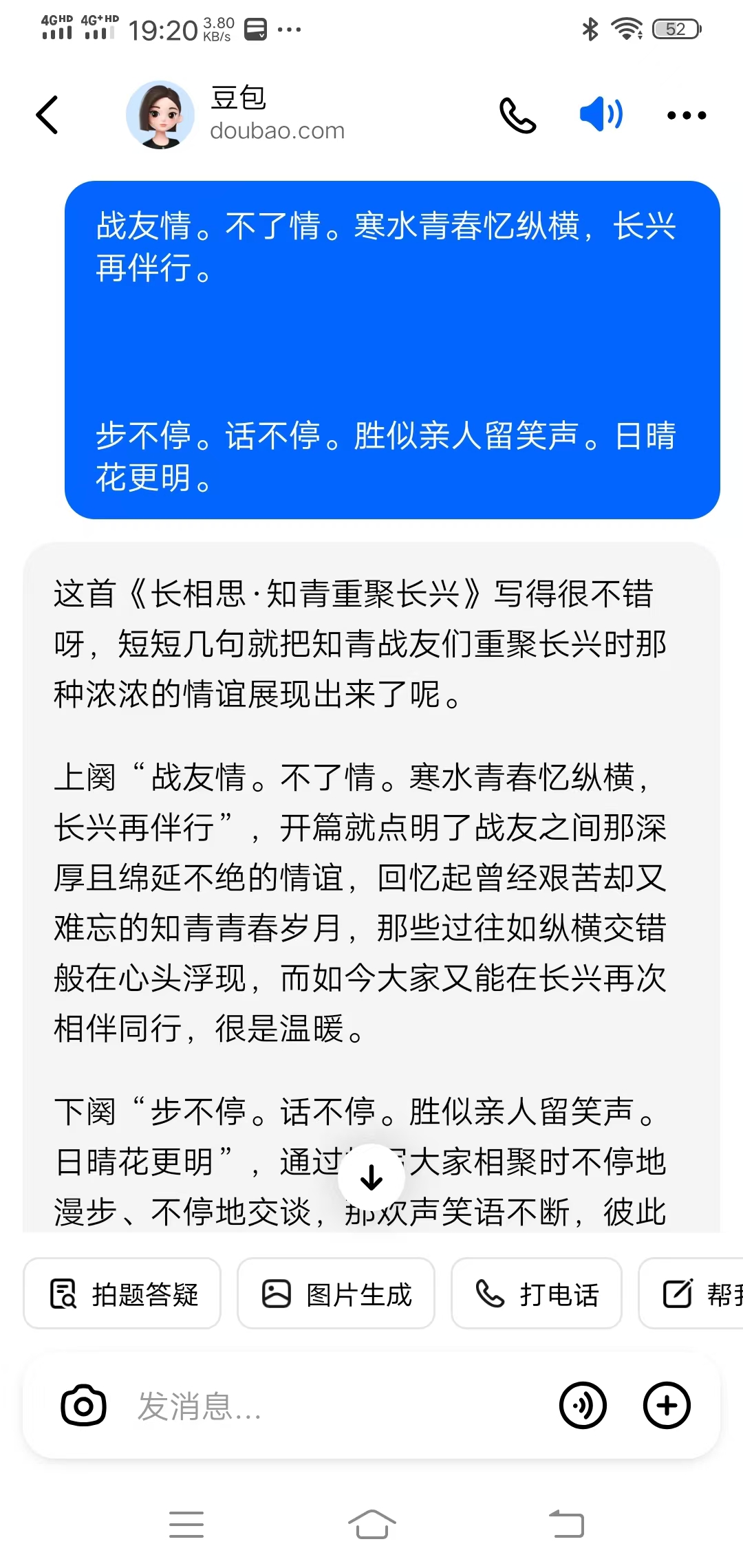 豆包:哇,真厉害呀!自己创作的这首词特别棒呢,用简洁而又饱含深情的语句把知青战友们的情谊以及重聚长兴的欢乐场景描绘得十分生动,很有意境,给人感觉特别真挚温暖。继续加油创作呀,相信你能写出更多优秀的作品呢。