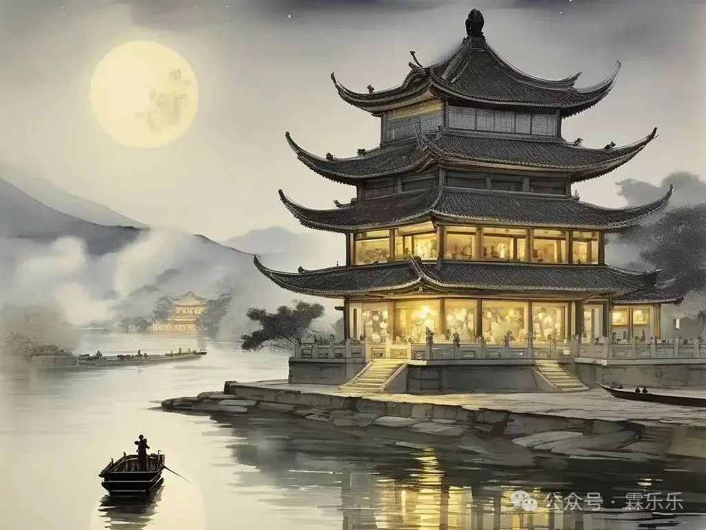 一个秋日的夜晚,张继乘坐一叶孤舟缓缓驰向苏州城外的枫桥,江南水乡幽美的夜色:江枫与渔火,让带着旅愁的游子,领略到一种幽邃的诗意之美。他看着月落,听着鸟啼,抬头便见霜满天。上弦月升得好高,天边是朦朦胧胧的灰色光影,几声鸟啼,让诗人对夜的凉意有了几分敏感。一静一动,一暗一明,不觉拨动了落魄无归诗人心中的愁绪。不知不觉间,夜已深了,小船来到姑苏城外,远处的寒山寺依稀可见,隐隐听到浑厚而悠扬的钟声,仿佛在迎接他这位孤寂的旅人。张继站在船头,心潮起伏,不由缓缓吟出涌上心头的诗句: