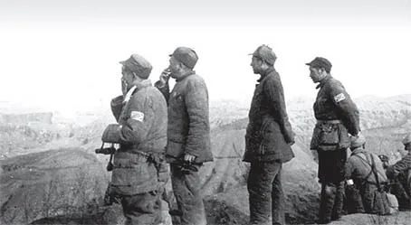 ◆1947年3月,彭德怀(左二)、习仲勋(左三)等在青化砭战场前线阵地上。