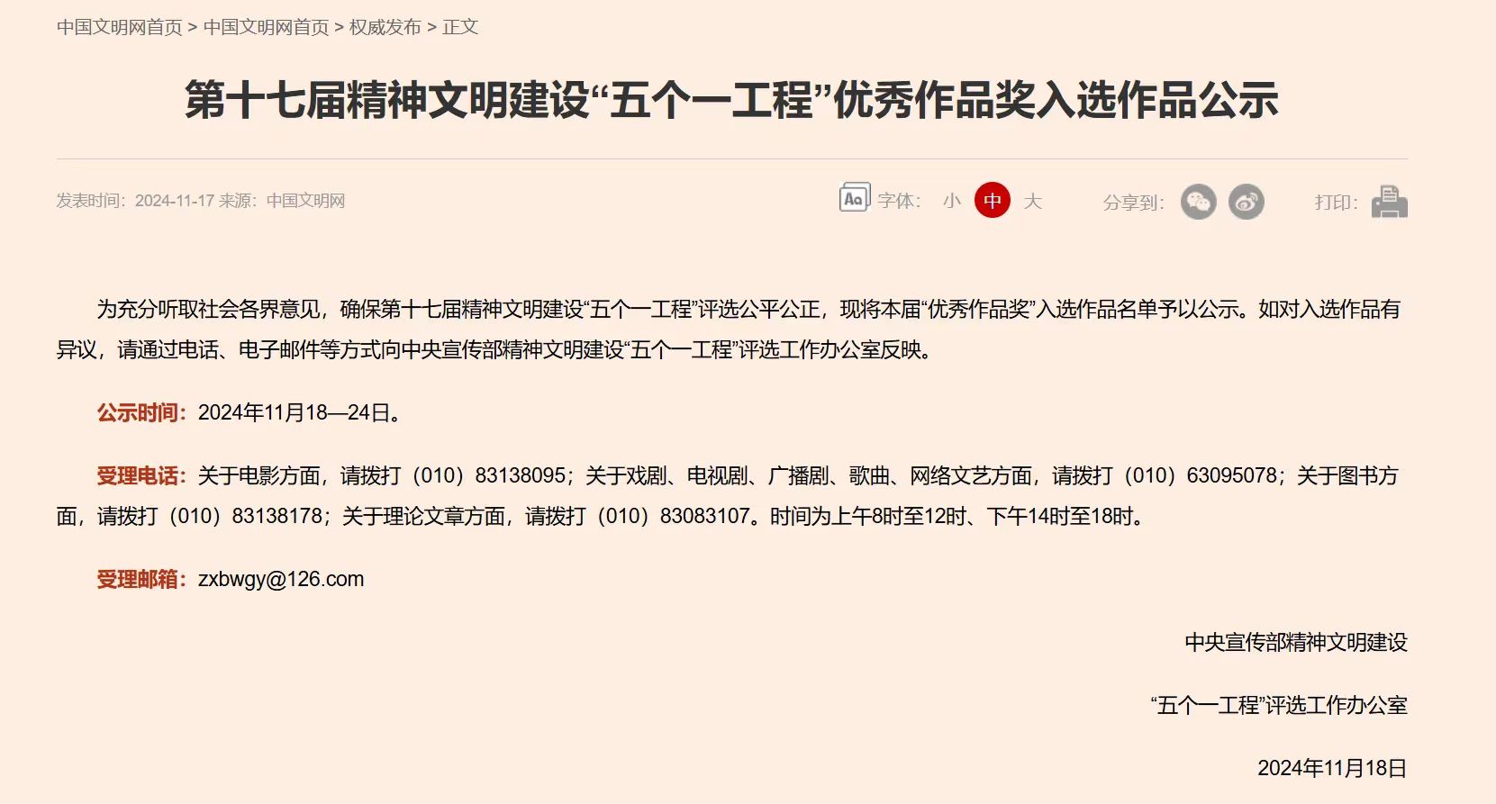 11月18日,中央宣传部精神文明建设“五个一工程”评选工作办公室发布《第十七届精神文明建设“五个一工程”优秀作品奖入选作品公示》,对入选第十七届精神文明建设“五个一工程”的优秀作品名单予以公示。