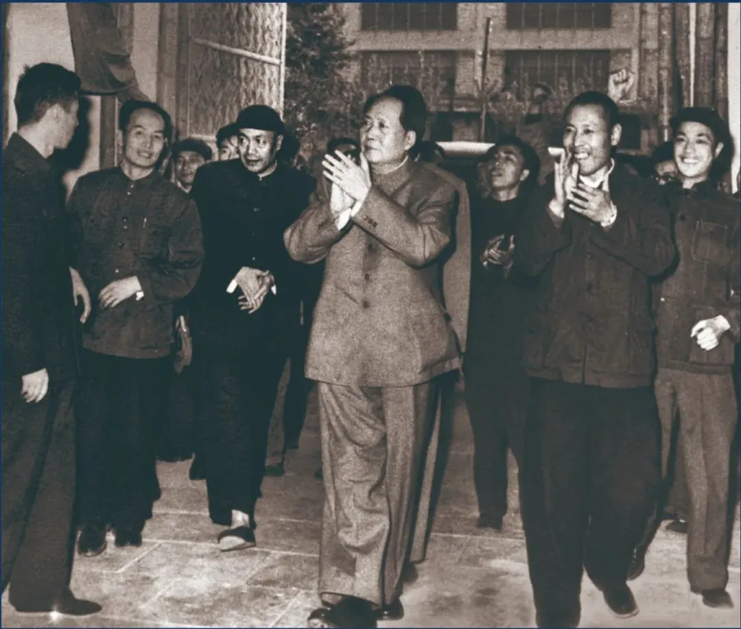 ▲1961年5月1日下午3点20分,毛主席在上海市委书记柯庆施陪同下到电机厂草棚大礼堂与上海工人阶级共庆“五一”国际劳动节