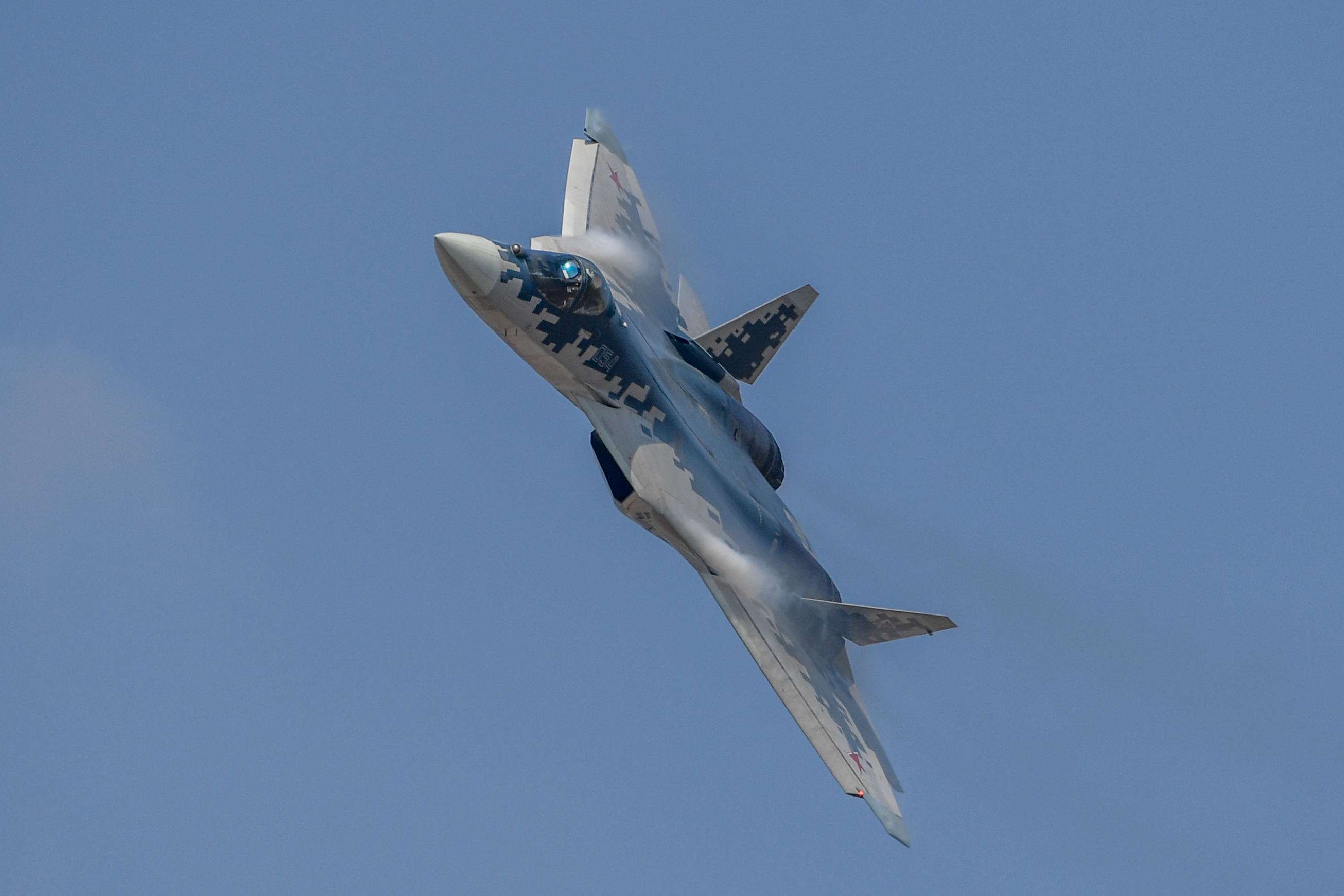 11月12日,俄罗斯苏-57战机在珠海航展上进行飞行表演。(新华社记者 梁旭 摄)