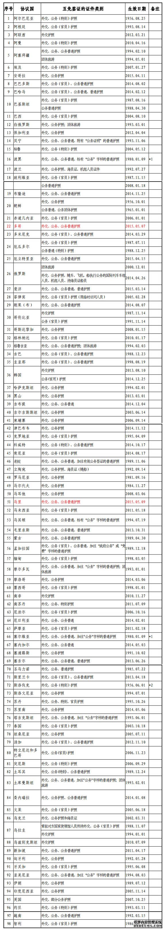 据中国领事服务网消息,外交部今日发布了最新版的中国与外国互免签证协定一览表,目前有98个国家对外交护照实行互免签证政策,6个国家对团体旅游实行互免签证政策,分别是阿塞拜疆、白俄罗斯、俄罗斯、格鲁吉亚、摩尔多瓦和土库曼斯坦,巴哈马、斐济、毛里求斯和圣马力诺4个国家对中国普通护照实行互免签证政策,中国公民持所适用的护照前往下列国家短期旅行通常无需事先申请签证。