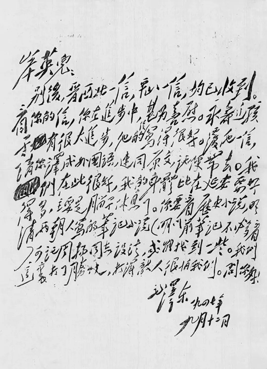 ◆毛泽东1947年9月写给毛岸英的一封信,表扬他在实际工作中取得进步。