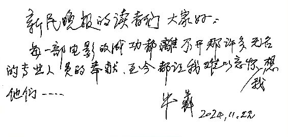 第一遍,“新民晚报”四个字没写完,他就停笔了,因为放在包里的水笔很久没用,第一个字书写不够顺畅,“这不行,重写吧。”第二遍,“每一部电影的成功都离不开许多无名专业……”还没写下去,他又停顿住了,“不对,‘无名’和‘专业’中间得有一个顿号,否则不通。”于是翻过页来,再重写。