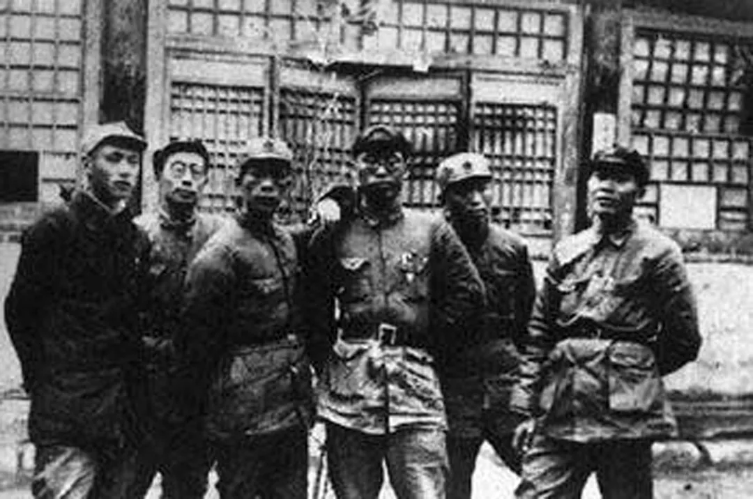 ◆1937年,罗荣桓担任军委后方政治部主任时,与谭政等合影。左起:萧文玖、傅钟、莫文骅、罗荣桓、刘亚楼、谭政。