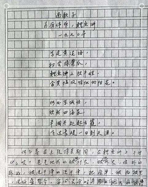 每一次,读父亲在鲤鱼洲的诗词,脑海中都会浮现一幅幅当时的画面。在体力、精神和心理几重压力和磨难下,他用填词赋诗如此文艺之形式,消磨无眠的夜晚,记录内心之苦闷与无奈,又在字里行间展现出精神的不屈与期盼。