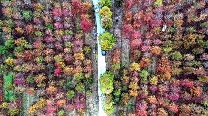 崇明东平国家森林公园水杉枝叶渐黄。 本报记者 孟雨涵 摄