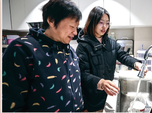 适老化改造评估师沈赛赛(右)正在为陆阿姨讲解全新安装的适老化设施的使用方法。 文汇报记者 袁婧摄