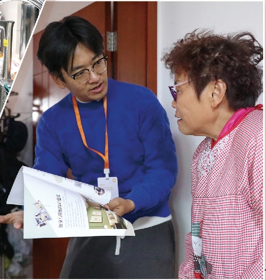 适老化改造评估师(左)正在入户调研老人需求。 文汇报记者 叶辰亮摄 制图:张继