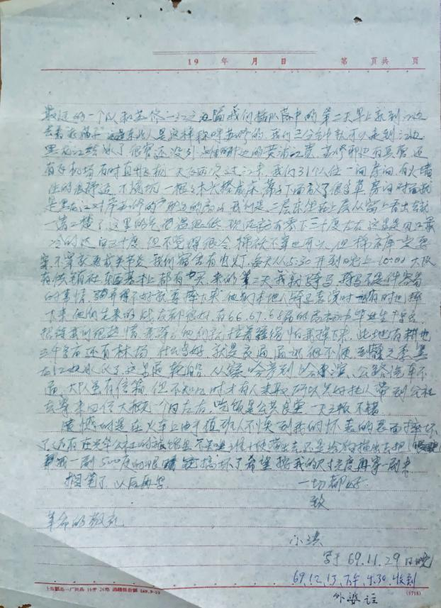 收藏者陈固说明:--------以下是上海市汾阳中学六九届初中学生李小洪,1969年11月21日离开上海,下放于黑龙江大兴安岭地区呼玛县金山公社察哈彦大队。到达大队于11月29日给家中寄出的第一封信;