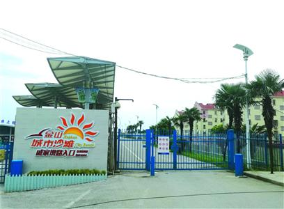 位于金山石化海滨的金山城市沙滩属于国家4A级旅游景区。7月15日中午,记者来到金涛路最西端的沪杭公路口,看到约6米宽的金涛路上已搭起了多重大门,无法自由通行。第一道大门口的装饰墙上镶嵌着“金山城市沙滩戚家墩路入口”的醒目标志。