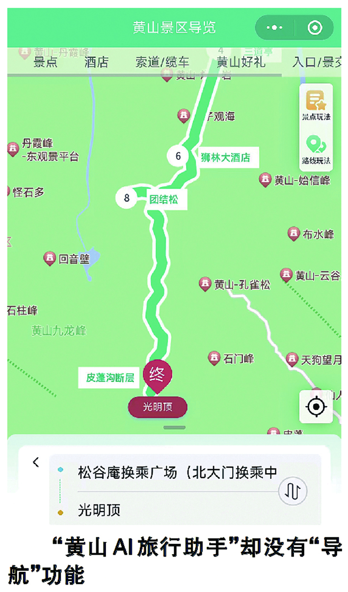 用它来做旅行助手效果如何呢?记者在景区内作了体验。从北大门进入景区后,来到松谷庵换乘广场。点击“导览”,将终点设为“光明顶”,小程序随后给出了途经11个景点、预计用时354分钟、预计距离9949米、台阶数为9930个的步行路线,以及标注出景点的线路电子地图。不过,在随后的步行途中,记者发现该“导览”却无“导航”功能。而且,AI识景功能也无法识别现场拍摄的部分照片。对此,景区工作人员建议使用名为“智游黄山”的另一款小程序来导航。
