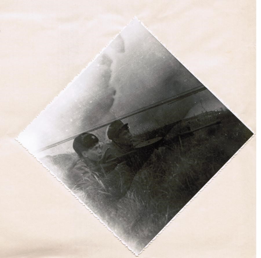 这张照片是我们穿着兵团的黄布军装,拿着连部武装班的枪到大堤外照的,那枪是苏式的转盘机枪,我们在影片中看到志愿军在朝鲜战场上用过此武器。当时鄱阳湖水位很低,所以靠近大堤没水,全是草地,我们就趴在草地上拍了此照。此照在冲印时出了一点问题,有了黑痕。但无形中起到了特殊的作用,好像我们趴在战壕里,而且还有点战火纷飞的味道。