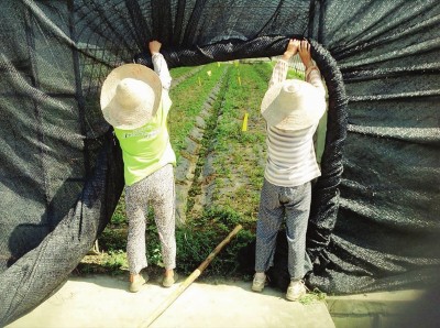 “农业工人”给蔬菜大棚拉上遮阳的黑色防晒网。