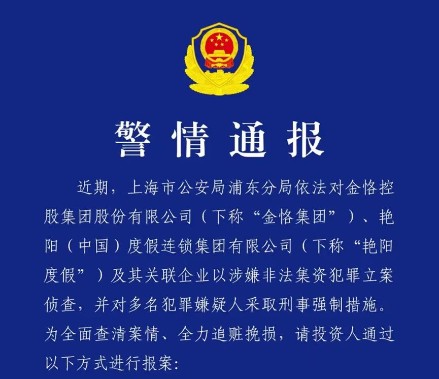 金恪集团、艳阳度假及其关联企业,涉嫌非法集资,被立案侦查。