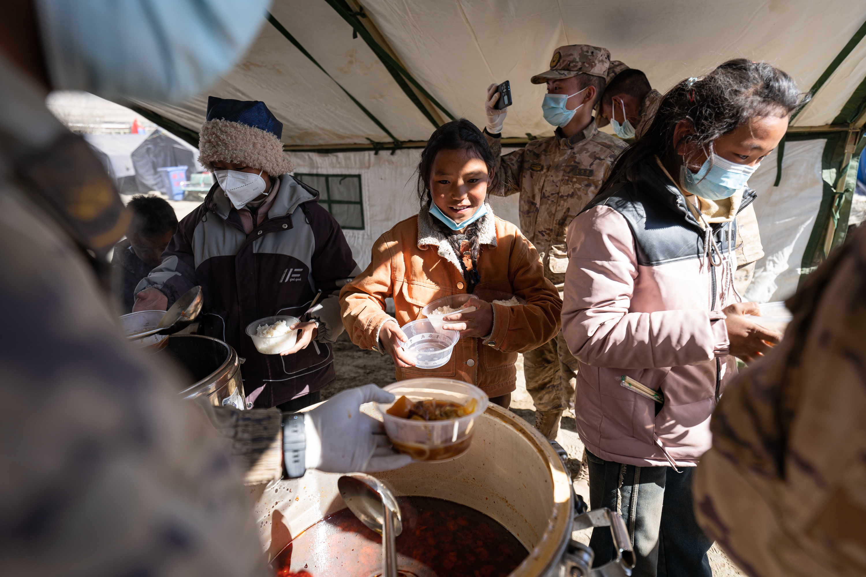 在定日县长所乡森嘎村,群众在排队打饭。(新华社)