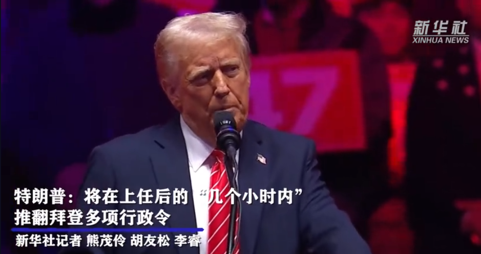 特朗普19日下午在首都华盛顿特区第一资本体育馆举行的集会上说,拜登政府的每一项“激进而愚蠢”的行政命令,在他宣誓就职后的几小时内都会被废除。他还称,自己的上任将结束“美国衰退的四年”。