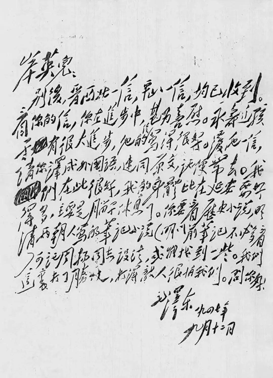 毛泽东1947年9月写给毛岸英的一封信,表扬他在实际工作中取得进步。