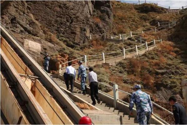 上山的路,是战士们一级级修建的,从山脚下到山顶共有247级台阶,顺着山势,这些台阶曲折蜿蜒,有种“蛇盘鸟栊,势与天通”的气势。战士们给这条路起名“爱岛路”。
