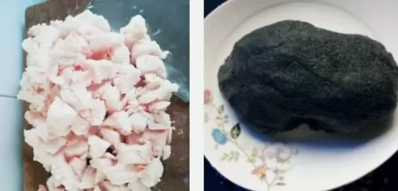 撕去网衣的猪板油丁和黑洋酥猪油馅