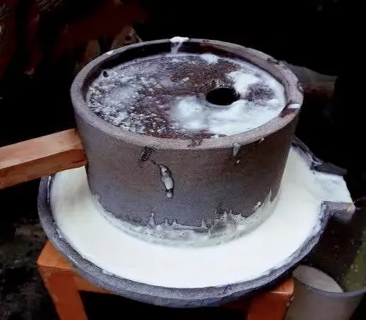 磨水磨粉是个细活,母亲总是隔夜把糯米淘干净,浸泡一天再磨。正式开磨时,母亲右手用大调羹把带水的糯米加到磨孔里面,她左手紧捏石磨的手柄,随着手臂一圈又一圈地运动,磨盘也在不紧不慢地匀速转动,雪白的米浆从磨缝中缓缓地渗了出来。