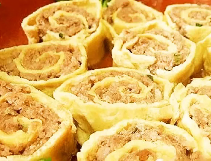 等蛋皮冷却后,用刀把蛋皮边上形状不规则的地方切除,均匀地抹上一层肉馅。然后把抹过肉馅的蛋皮慢慢卷起来,在合拢处抹一点蛋液粘住。