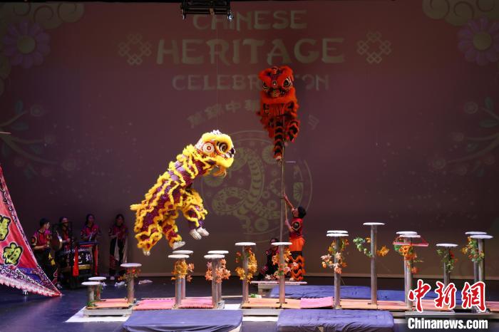 当地时间1月29日,加拿大大多伦多地区华人聚居的万锦市(Markham)与约克区在万锦剧院举行2025年中华文化月开幕礼。图为演员表演高桩舞狮。 中新社记者 余瑞冬 摄