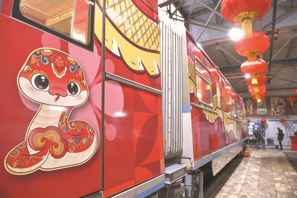 1月29日推出的这列中国春节主题列车,由莫斯科地铁公司与中方人员合作完成。车身整体以中国红作为底色,外部绘有巨龙、蛇等元素,列车内部则配有展示中国各地春节庆祝活动的图片。据悉,这列主题列车将在莫斯科地铁3号线运行一个月时间。