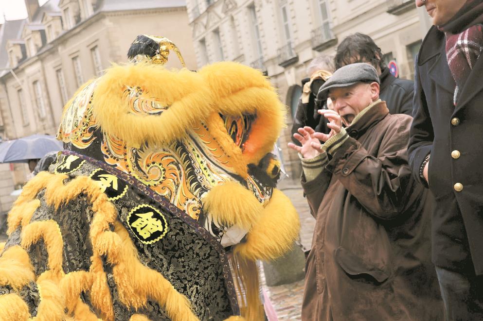 1月25日,舞狮表演者在法国雷恩街头与民众互动。