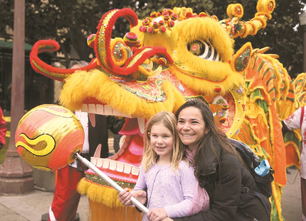 1月29日,在美国旧金山唐人街,一对母女与舞龙队伍合影。均新华社发