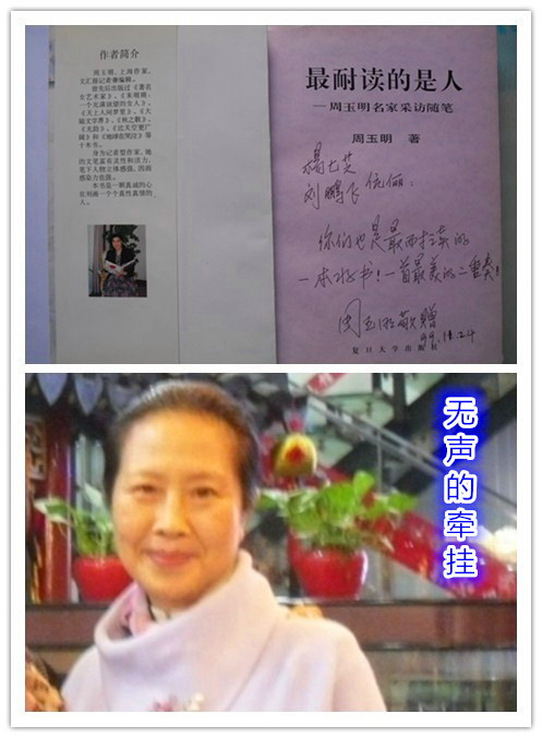 感动叫我随时翻开周老师的著作由浅入深地去体验去追慕。其中有赵老师的点评说:“周玉明的激情全然来自正义感。在她身上有一股豪气,一副侠骨心肠。在性质上,这仍然是属于‘路见不平,拔刀相助’的民族传统。她从18岁跨进文汇报的门槛起,她就恪守这条原则。她一直保有着满腔的正义感、真情、激情。这是难能可贵的,从而博得了文化艺术界普遍的称赞。···周玉明一直坚持呼唤人心、呼唤人情、呼唤人性。她淡薄功利,看重感情。她坦言道:‘我这个人不注重储蓄金钱,但我注重储蓄真情、友情。’凡是被她采访过的人物,几乎都成了她永久性的朋友,她的命运与她笔下人物的命运紧紧地捆绑在一起,这种血肉关系是不多见的。”