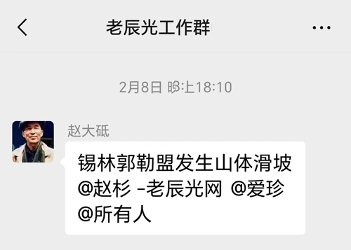 2月8日晚上18:10赵大砥老师还在“老辰光工作群”,要求网站对“锡林郭勒盟发生山体滑坡灾害”给予关注,这是赵大砥老师在工作群发出的最后一条微信,次日上午10:40溘然长逝。赵大砥老师为国为民战斗到生命的最后一息。赵大砥老师为弘扬和宣传红色文化呕心沥血,殚精竭虑,鞠躬尽瘁,死而后已。