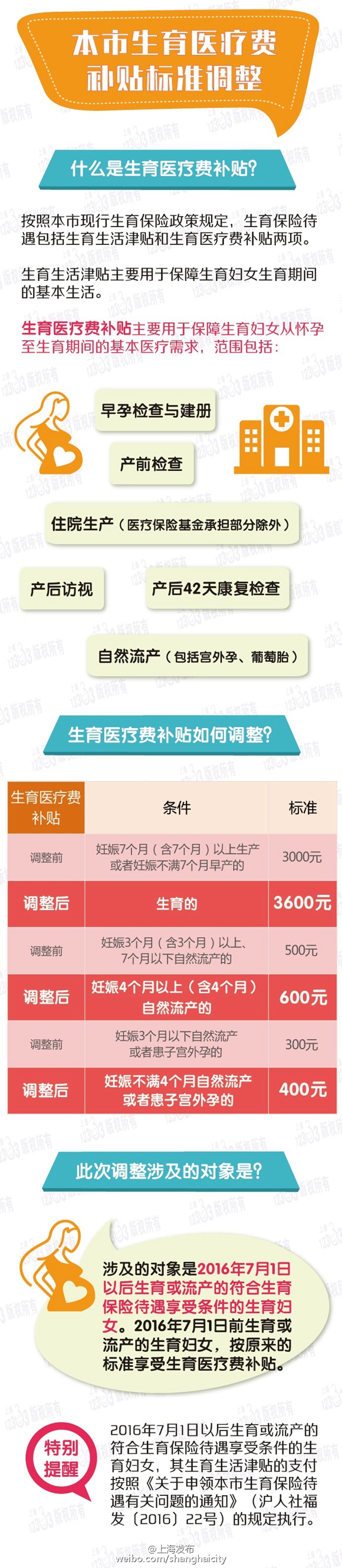 从上海市人社局获悉,2016年7月1日以后生育的符合生育保险待遇享受条件的生育妇女,其生育医疗费补贴将从原先的3000元调整至3600元。