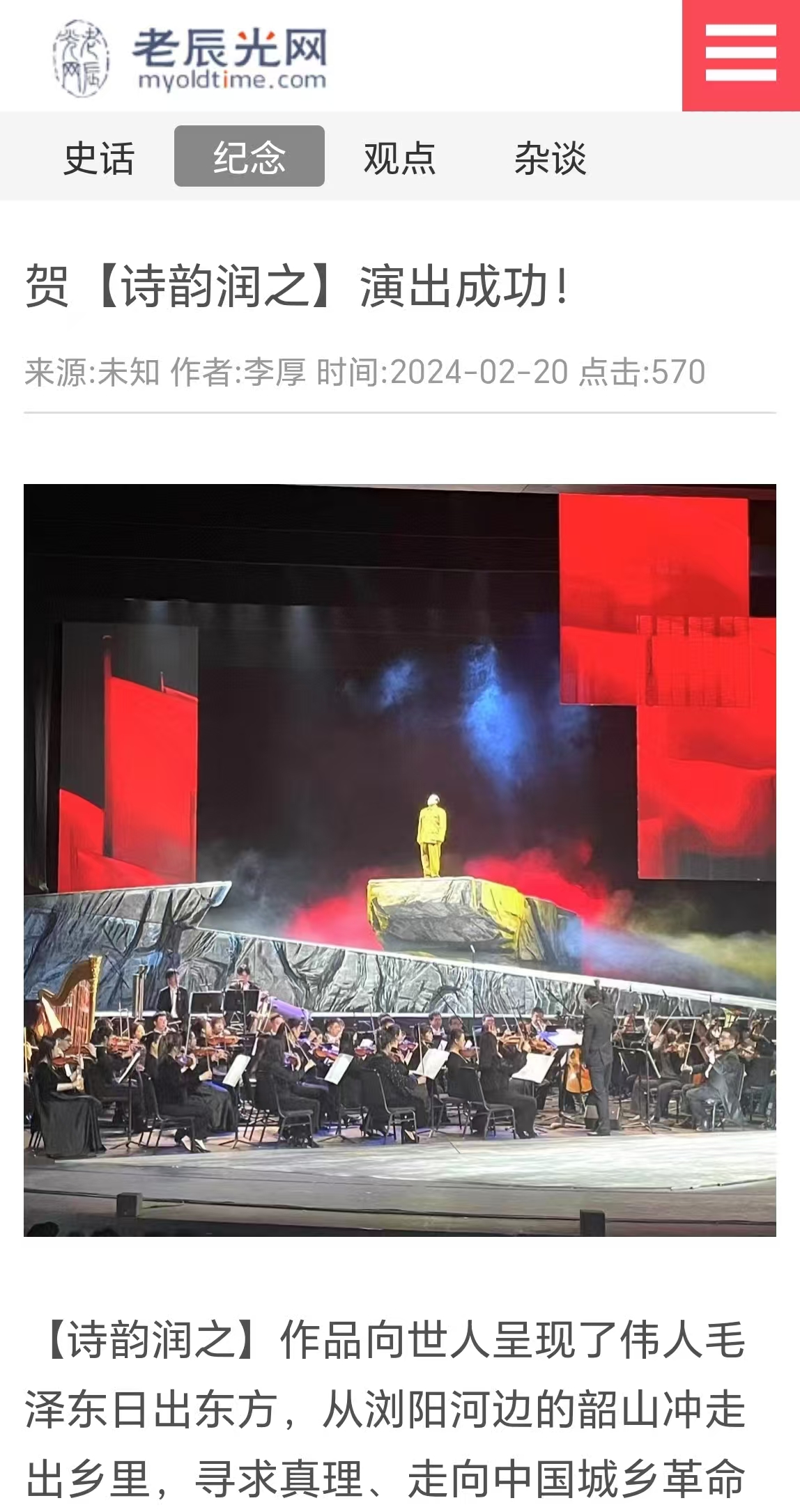 2024年刚过完春节不久的一天晚上,赵老师又在我们的微信中,发来他为出品人,将在上海大剧院举办为毛主席诗词朗诵和谱曲、并由上海电影制片厂等著名演员朗诵和上海爱乐乐团演唱演奏的大型交响乐史诗《诗韵润之》的宣传广告。他亲切打来电话询问我们同志需要观赏吗,要多少?赶快将数字与观摩人的姓名发给他,因怕时间紧耽误观赏,还要一个个发去联系方式,将一张张充满深情厚意的票子快递到这些同志的手里:不惜时间、精力和成本,将最宝贵的精神食粮赠送给革命的、热情宣传红色文化的同志们!
