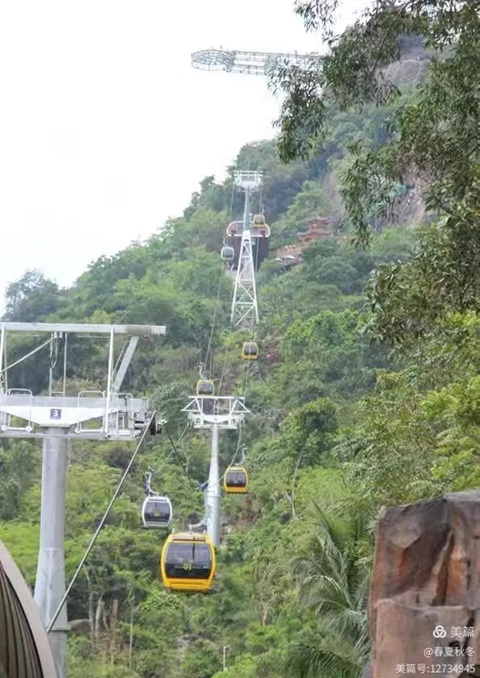 没有想到,索道并不登顶,只送到半山腰,登顶还得迈开双脚,想想胖乎乎的我,爬山也累,但看到山顶上的红旗,迎风飘扬,显然是在向我招手,虽然攀登五指山和保亭的七仙岭,因虚胖未能完成登顶,但这一次看到红旗,必须向山顶红旗冲锋,“不到长城非好汉”。