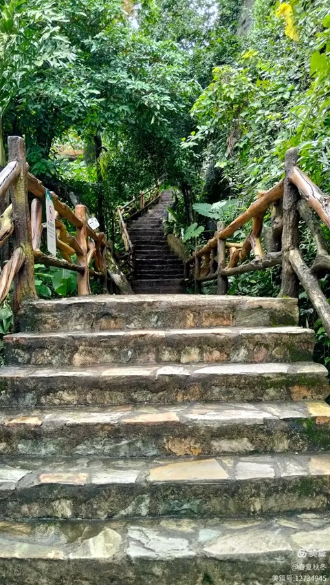 索道下来后,一看登顶还是的爬山。上山的梯路就在海南特有的雨林中,婉延迂迴,穿行于苍翠茂密的亚热带杂交林中。