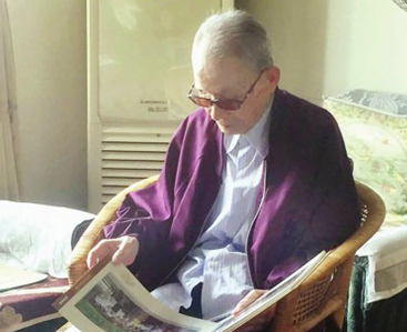 初见赵戈,着实让人震惊:一个人开着电动轮椅车出现在干休所接待厅的门口,双眼炯炯有神,身后的服务人员略带“无奈”看着这位坚持不让他人“搀扶”的96岁老人。老人至今身体硬朗,说话吐字清晰,岁月对他似乎格外“恩宠”。