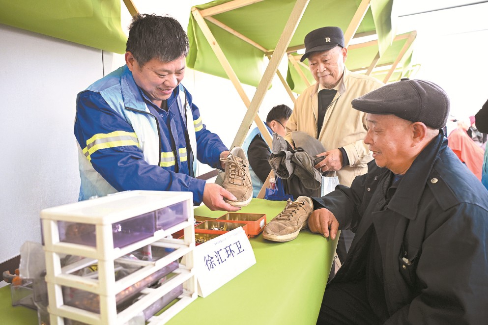 图为志愿者近日在漕河泾街道社区学雷锋活动现场给老人修鞋。